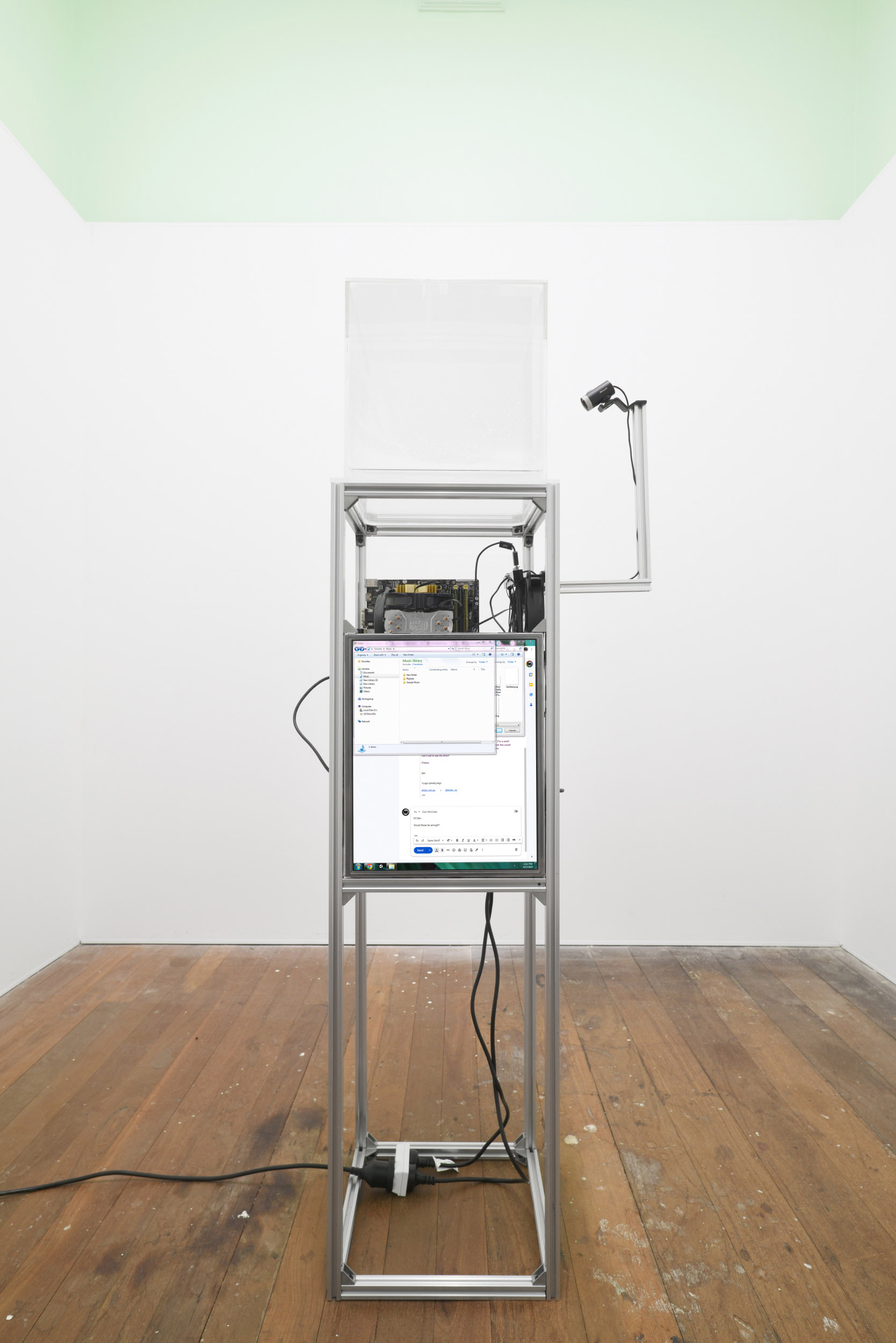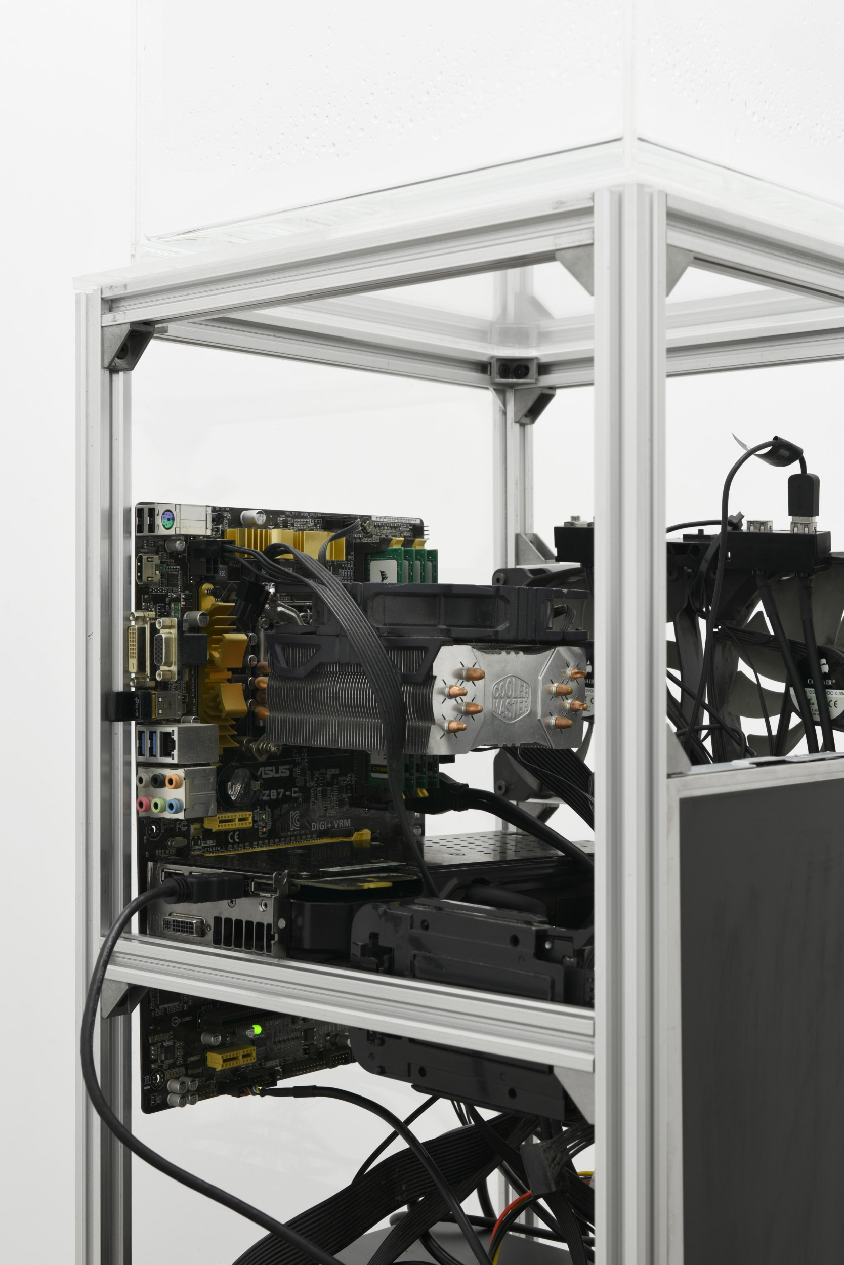 Condensation Cube by Hans Haacke (1963) replica, Personal Computer (ASUS z87-c,Cool Master CPU fan, Intel i5, Corsair Fan x2, Silverstone 600w power source, 120gb Samsung SSD, Philips Monitor 172B9TN), webcam, hardware extruded aluminium t-slot, perspex.